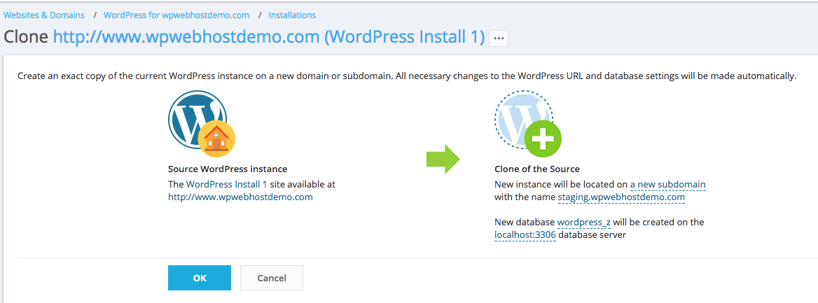 3. By default, the cloning mechanism will make a copy of your WordPress install as a subdomain "staging.yourwordpressdomain.com" . If you wish to change other "staging" subdomain name, click on the "a new subdomain" link and edit the subdomain as the pop-up box show. The changes will be reflected. The clone will also make a copy of the live database with a new database.